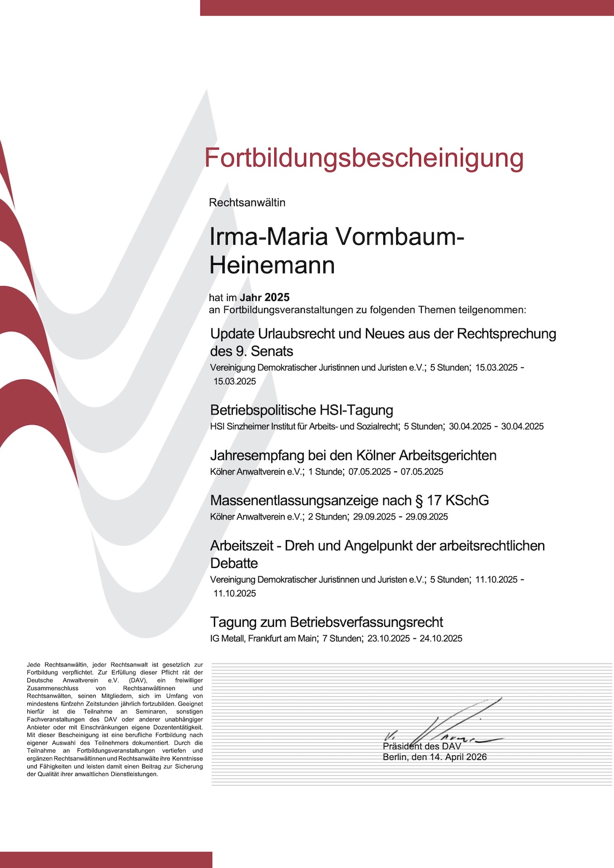Frau Vormbaum-Heinemann nimmt jedes Jahr im Umfang von mindestens 15 Stunden an arbeitsrechtlichen Fortbildungen teil. Hierfür erhält sie jährlich die Fortbildungsbescheinigung des Deutschen Anwaltvereins.